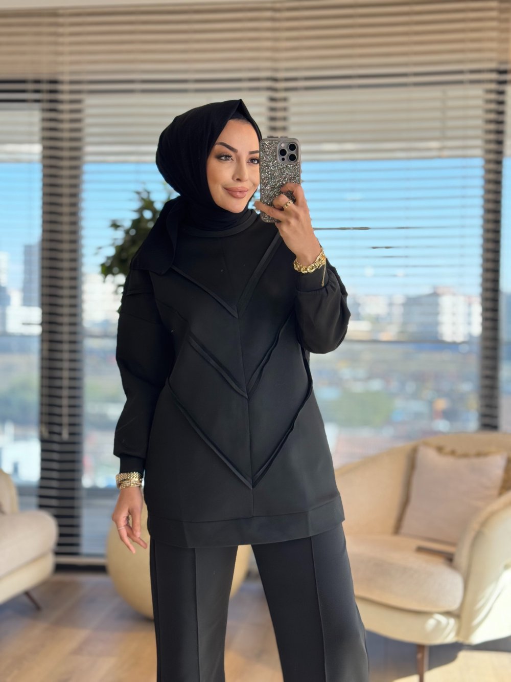 24034 Ön V Dikiş Parçalı Scuba Tunik Siyah