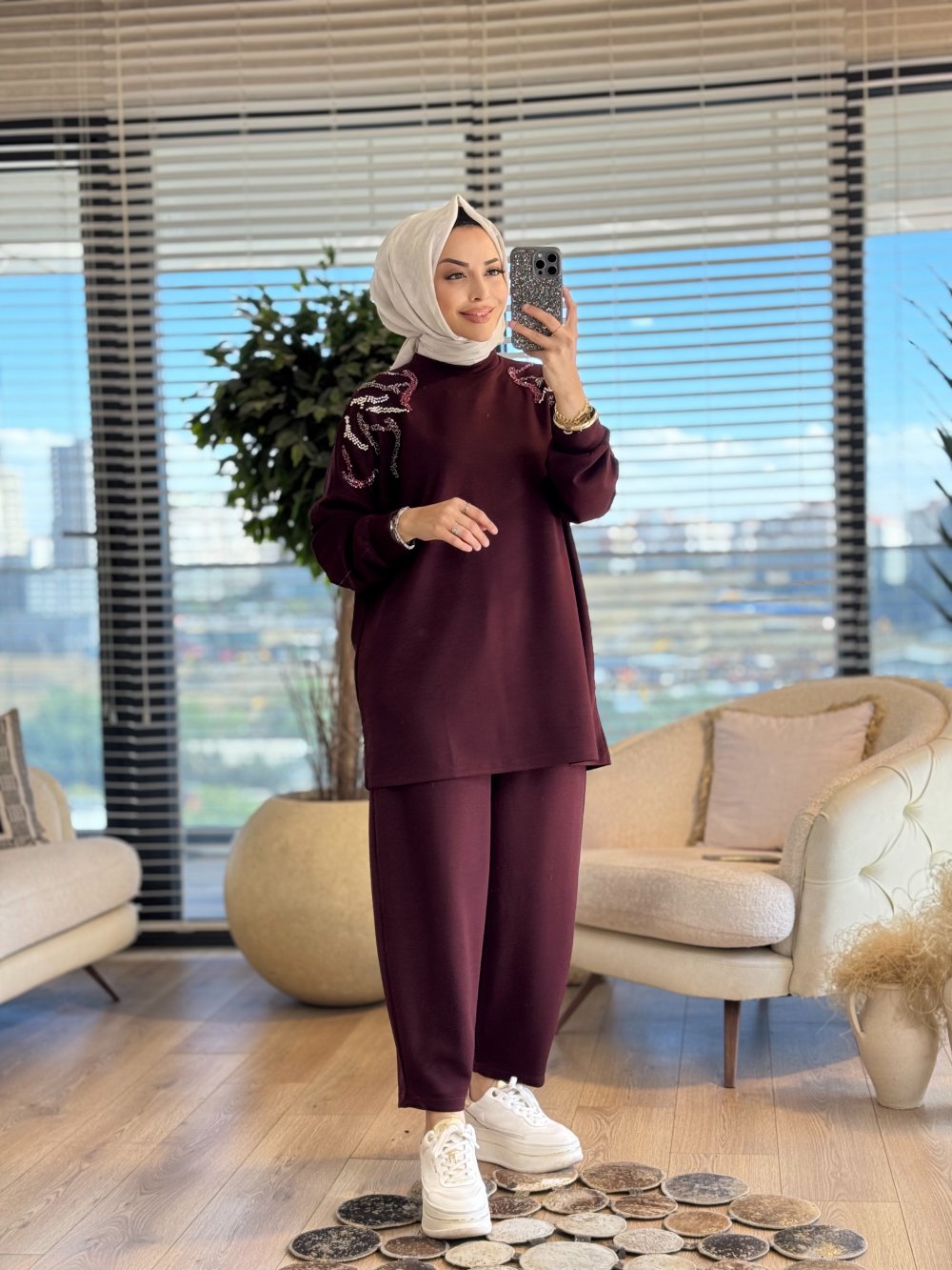 24364 Omuzları Boncuk işli Tunik Bordo