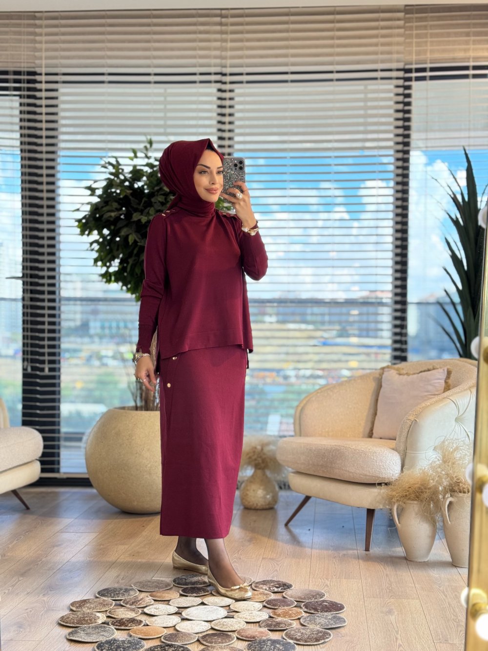 244 Omuz Apoletli Reglankol Triko Etekli Takım Bordo