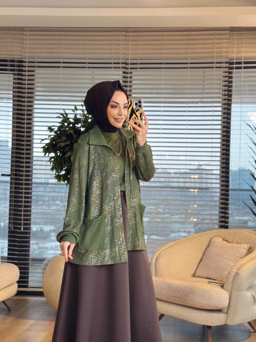 2445 Triko Üst Baskılı Hırka 2li Takım Haki