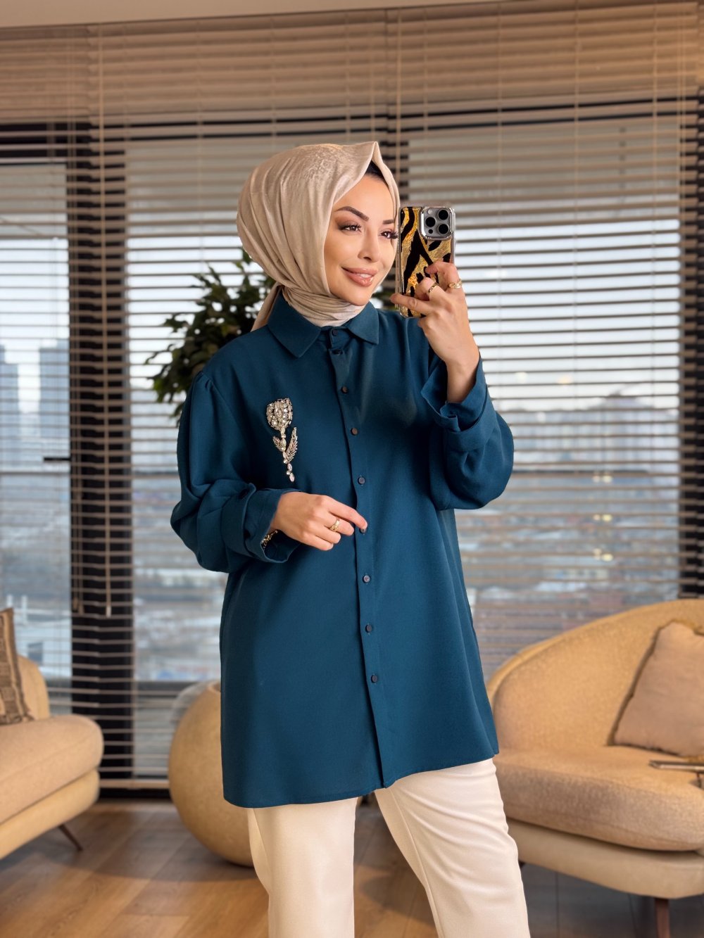 24550 Taş Lale İşlemeli Kolu Manşetli Gömlek Petrol