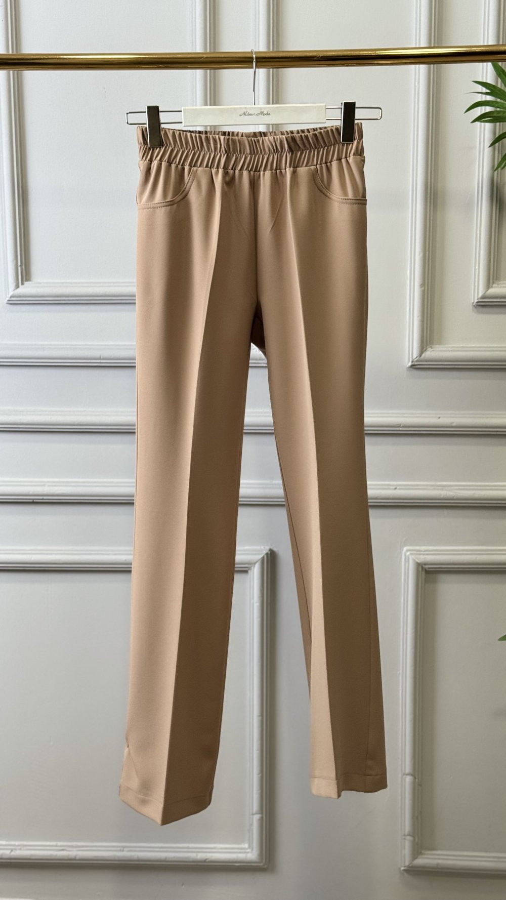 24589 İspanyol Paça Beli Lastikli Pantolon Latte