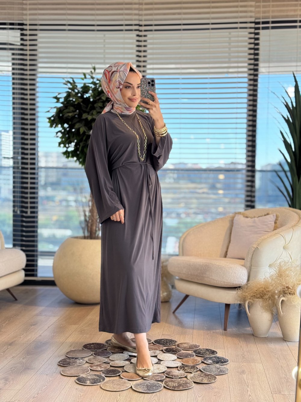 25117 Belden Bağlamalı Elbise Antrasit