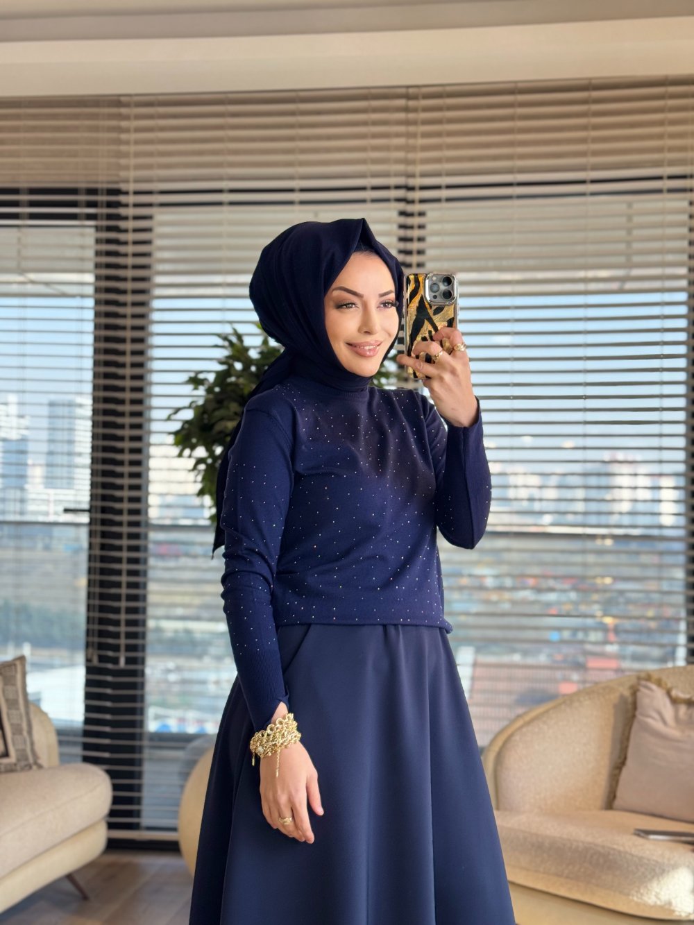25199 Ön Ve Kolları Taş Detay Triko Kazak Lacivert