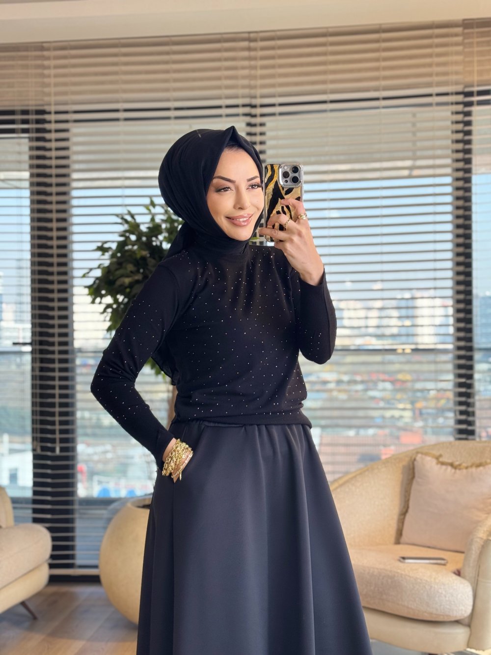 25199 Ön Ve Kolları Taş Detay Triko Kazak Siyah