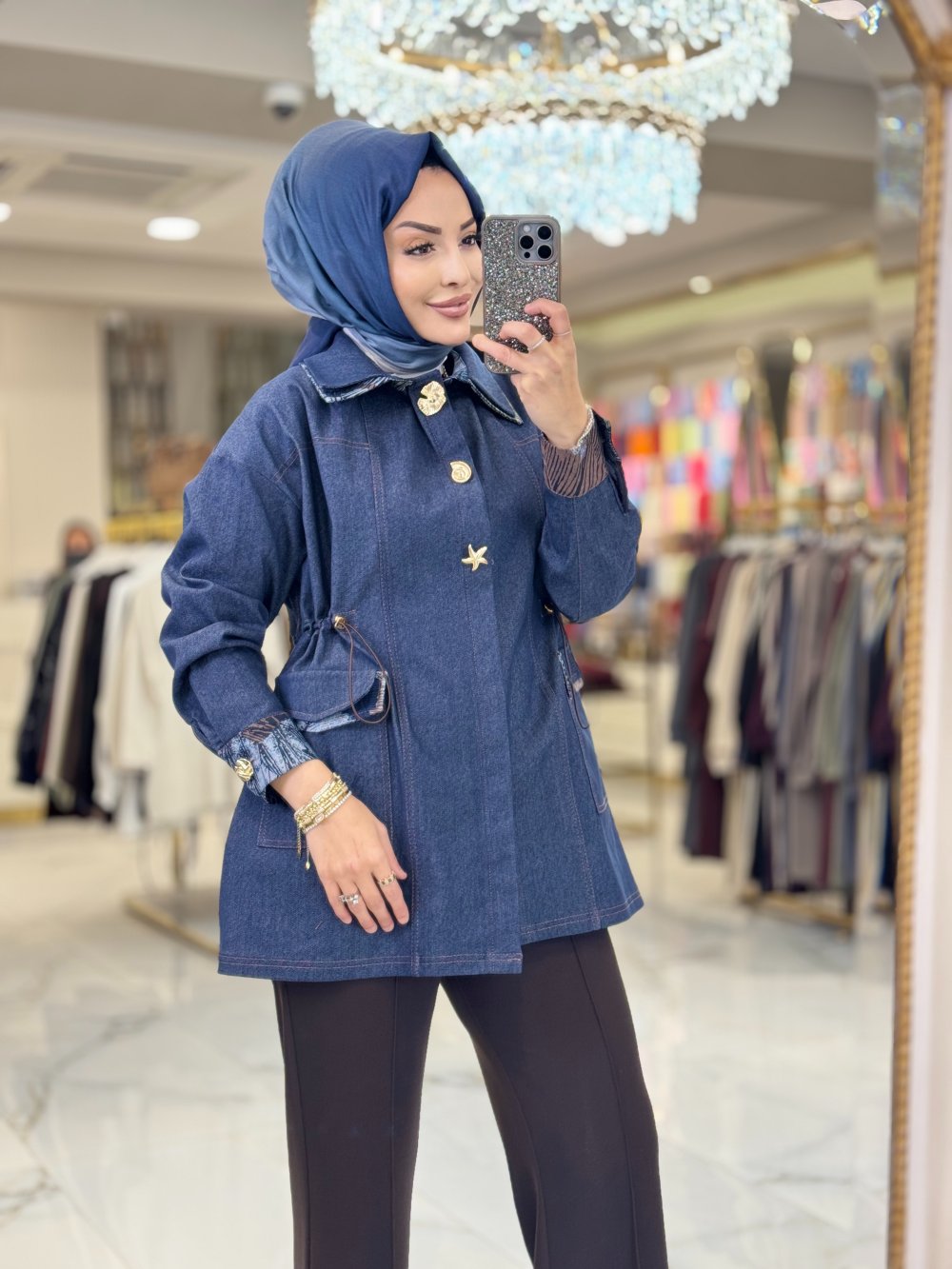 25545 Yaka Manşet Desen Parçalı Ceket Lacivert