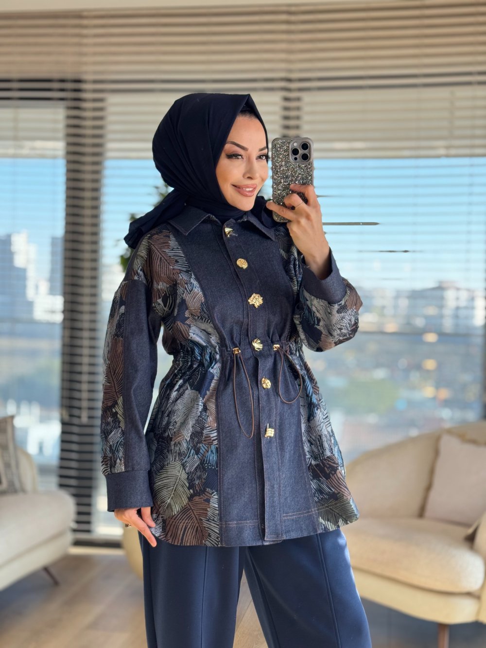25549 Kot Kol Ve Arka Desenli Gömlek Lacivert