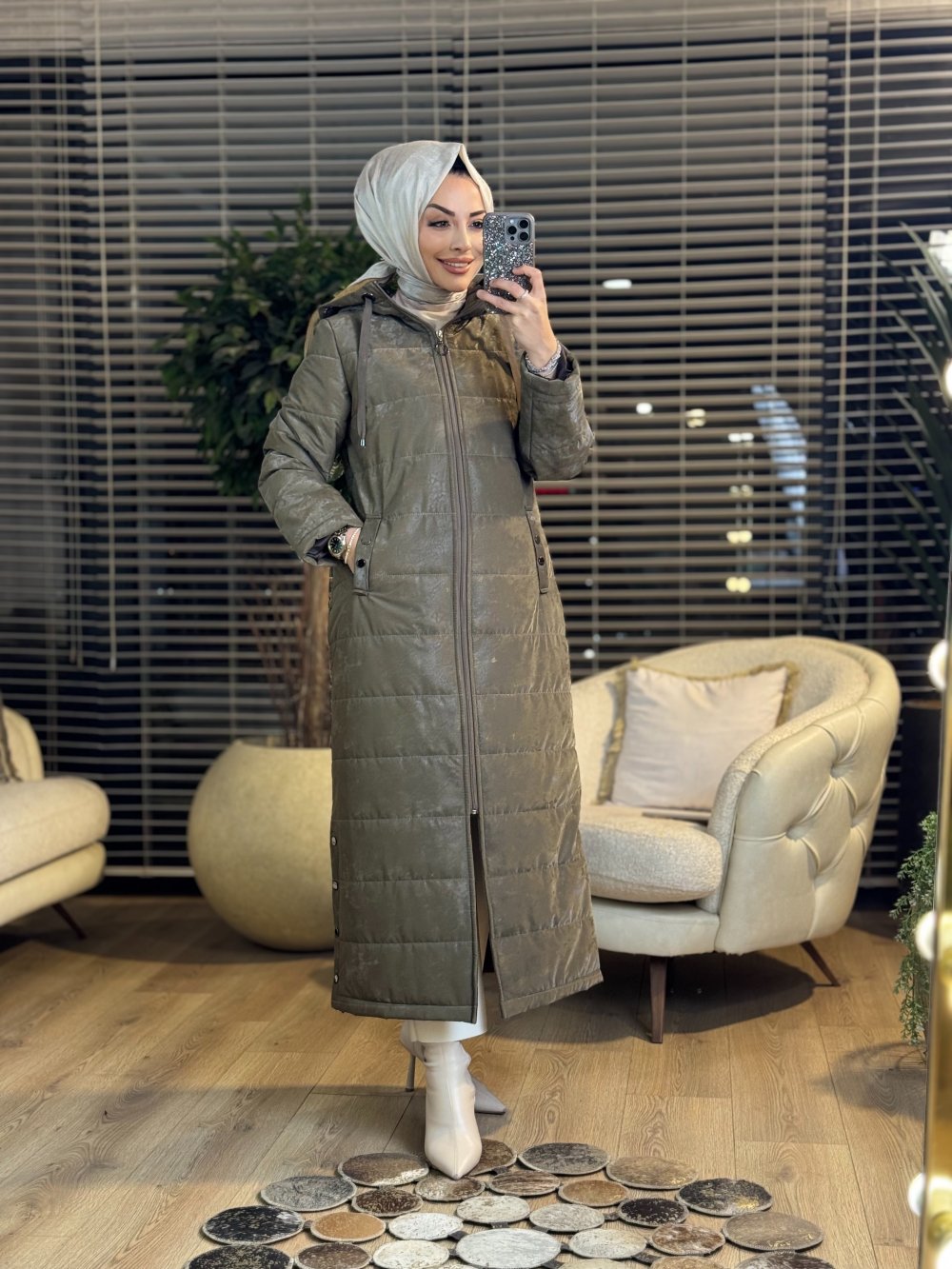 2565 Batik Kapitone Kapşonlu Uzun Kaban Haki