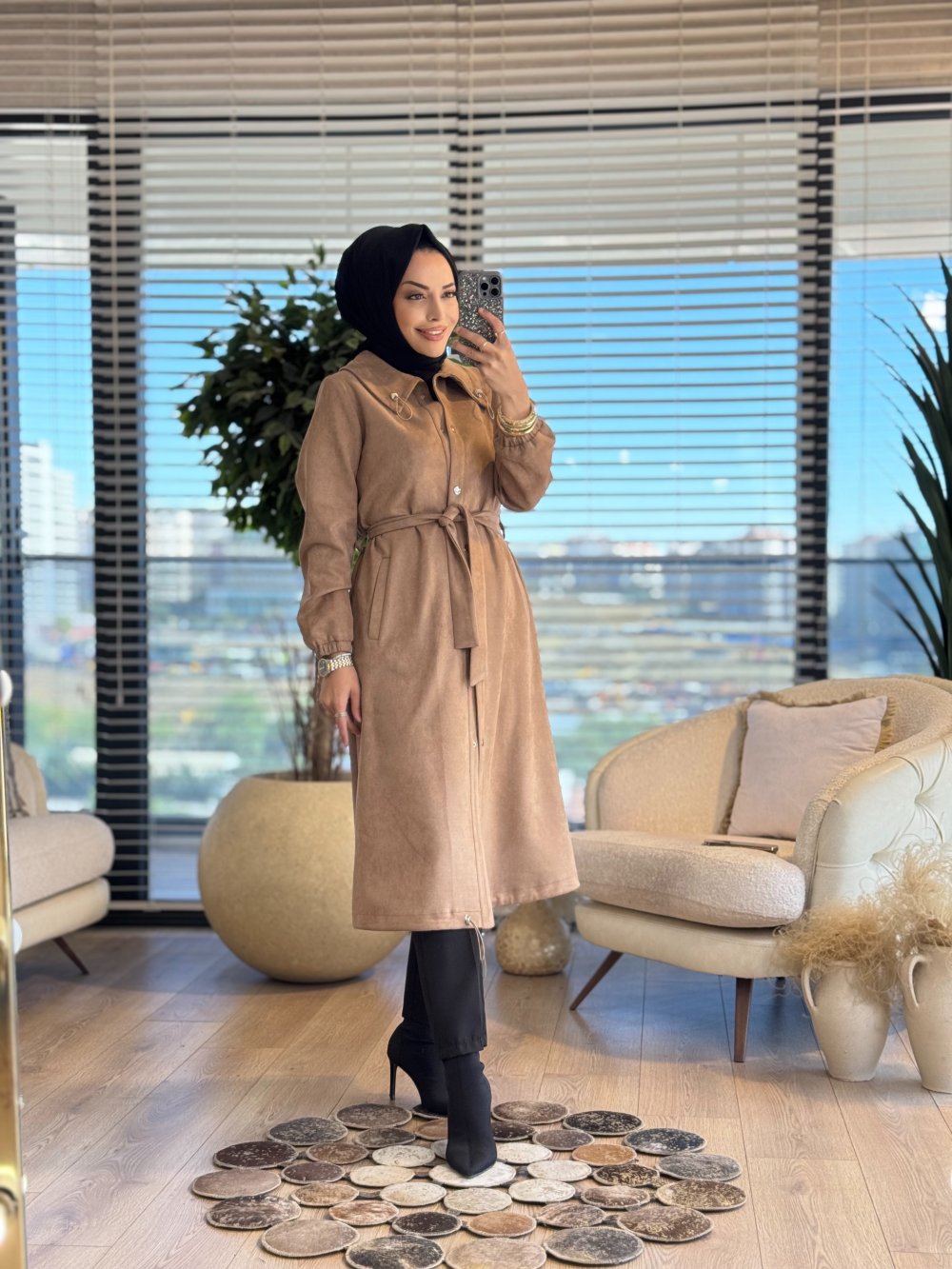 2569 Yakası Lastikli Süet Pardesü Bej