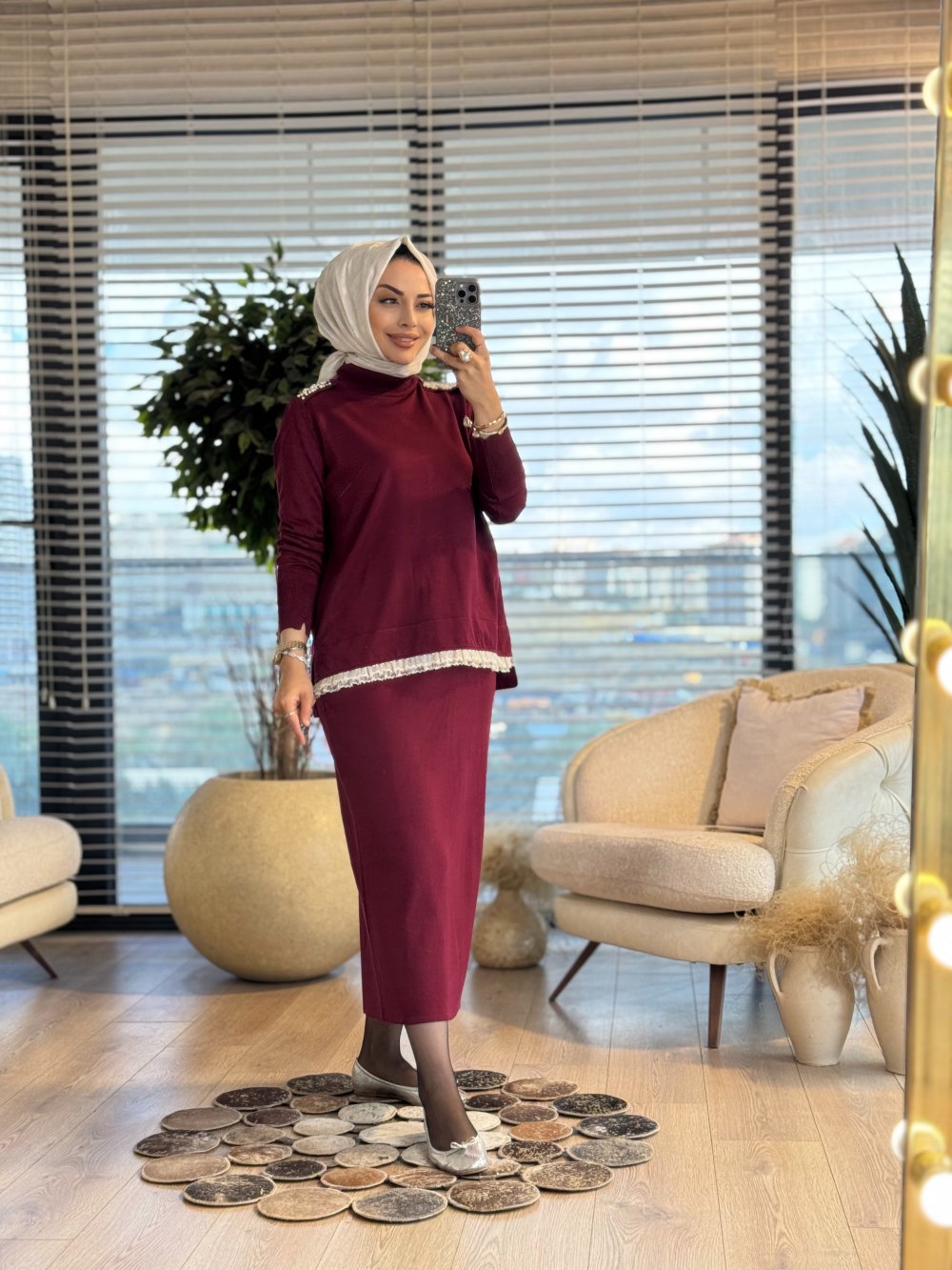 257 Omuzu İncili Dantelli Triko Etekli Takım Bordo
