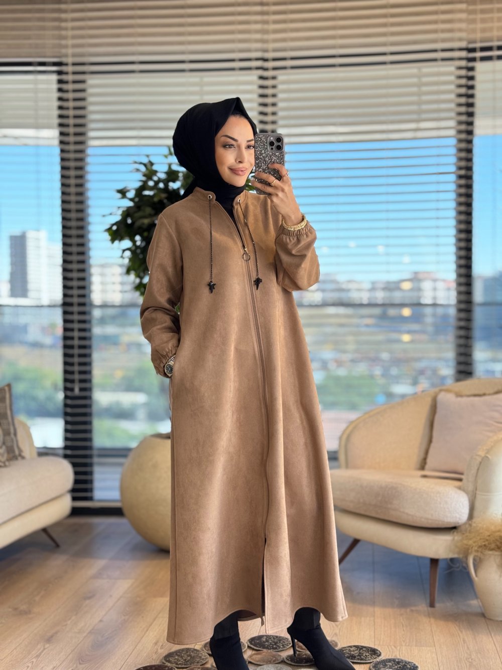 2572 Zincirli Hakim Yaka Süet Pardesü Bej