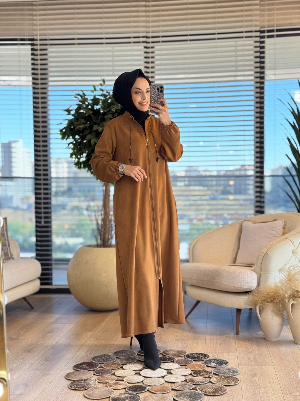 2572 Zincirli Hakim Yaka Süet Pardesü Taba