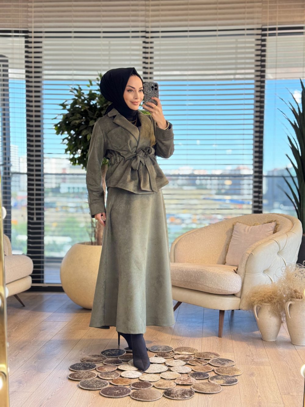 2573 Süet Beli Kuşaklı Etekli Takım Haki