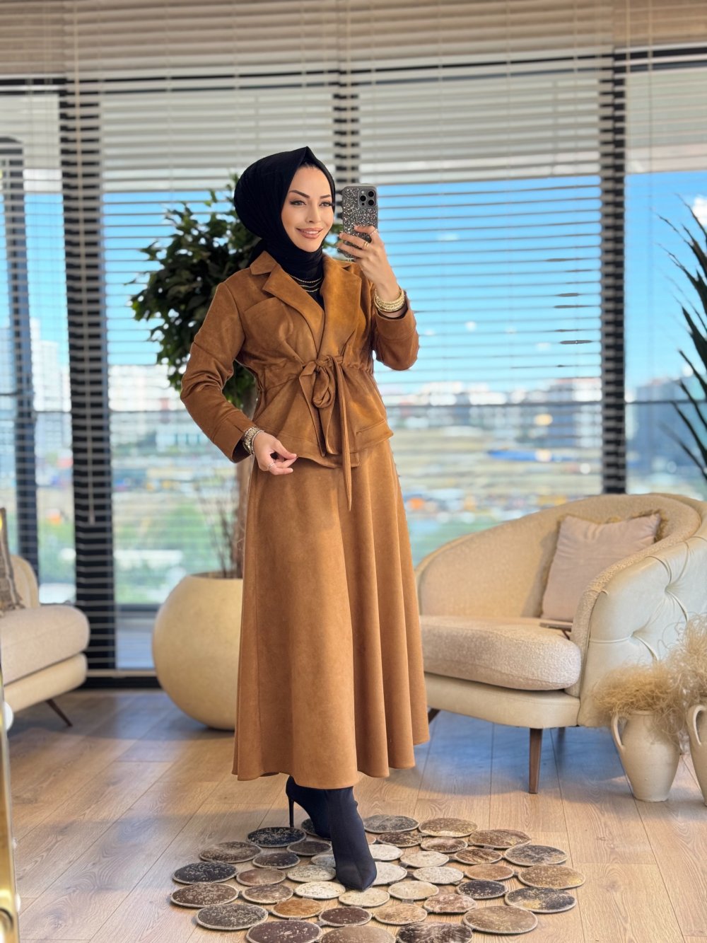 2573 Süet Beli Kuşaklı Etekli Takım Taba