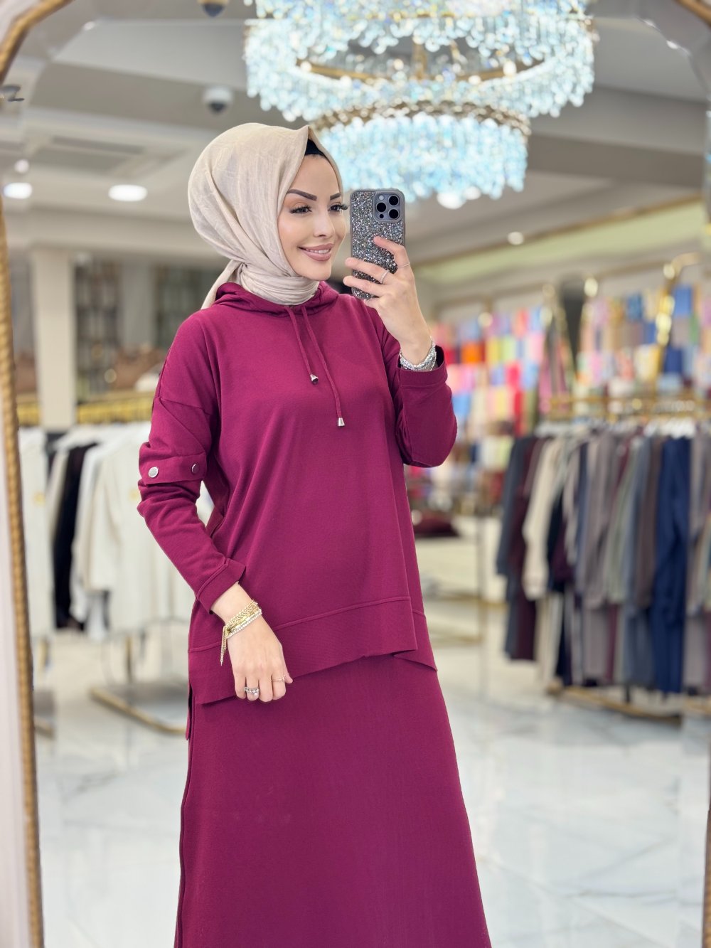 2597 Kapşonlu Etekli Triko Takım Bordo