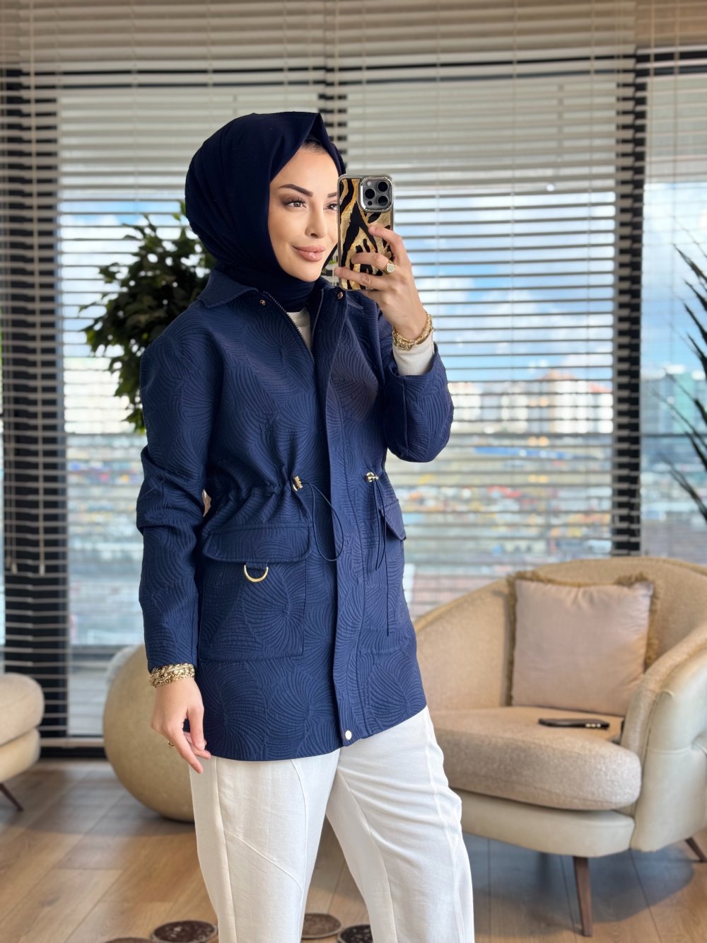 25KT525 Kendinden Desenli Fermuarlı Ceket Lacivert
