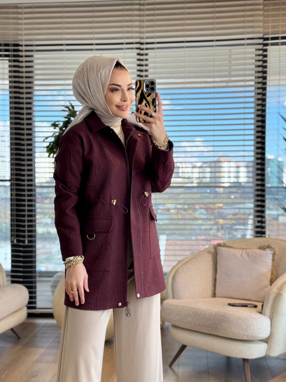 25KT525 Kendinden Desenli Fermuarlı Ceket Vişne