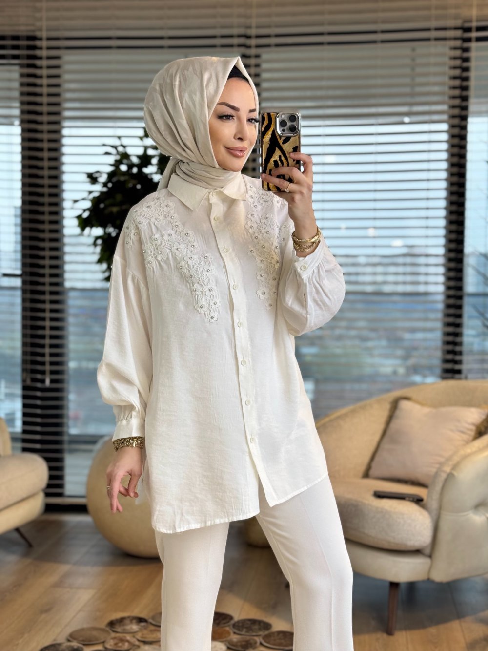 260141 Şık Aplikeli Gömlek Ekru