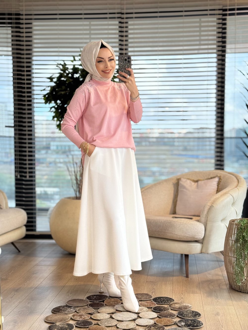 264 Omuzu Taşlı Yaprak Desenli Triko Tunik Pembe