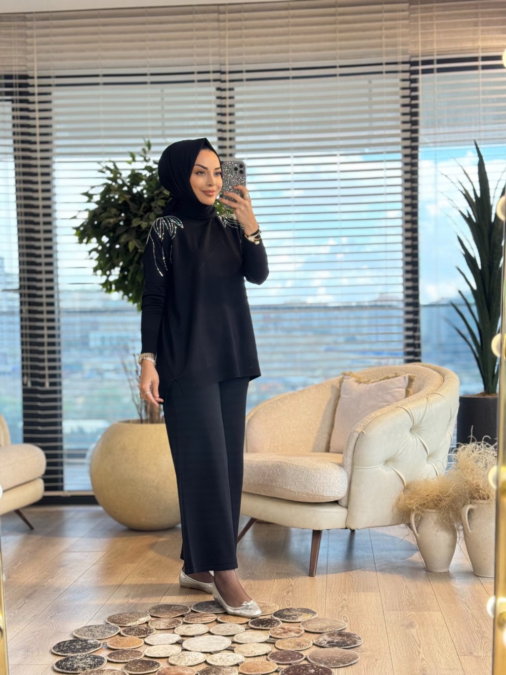 264 Omuzu Taşlı Yaprak Desenli Triko Tunik Siyah