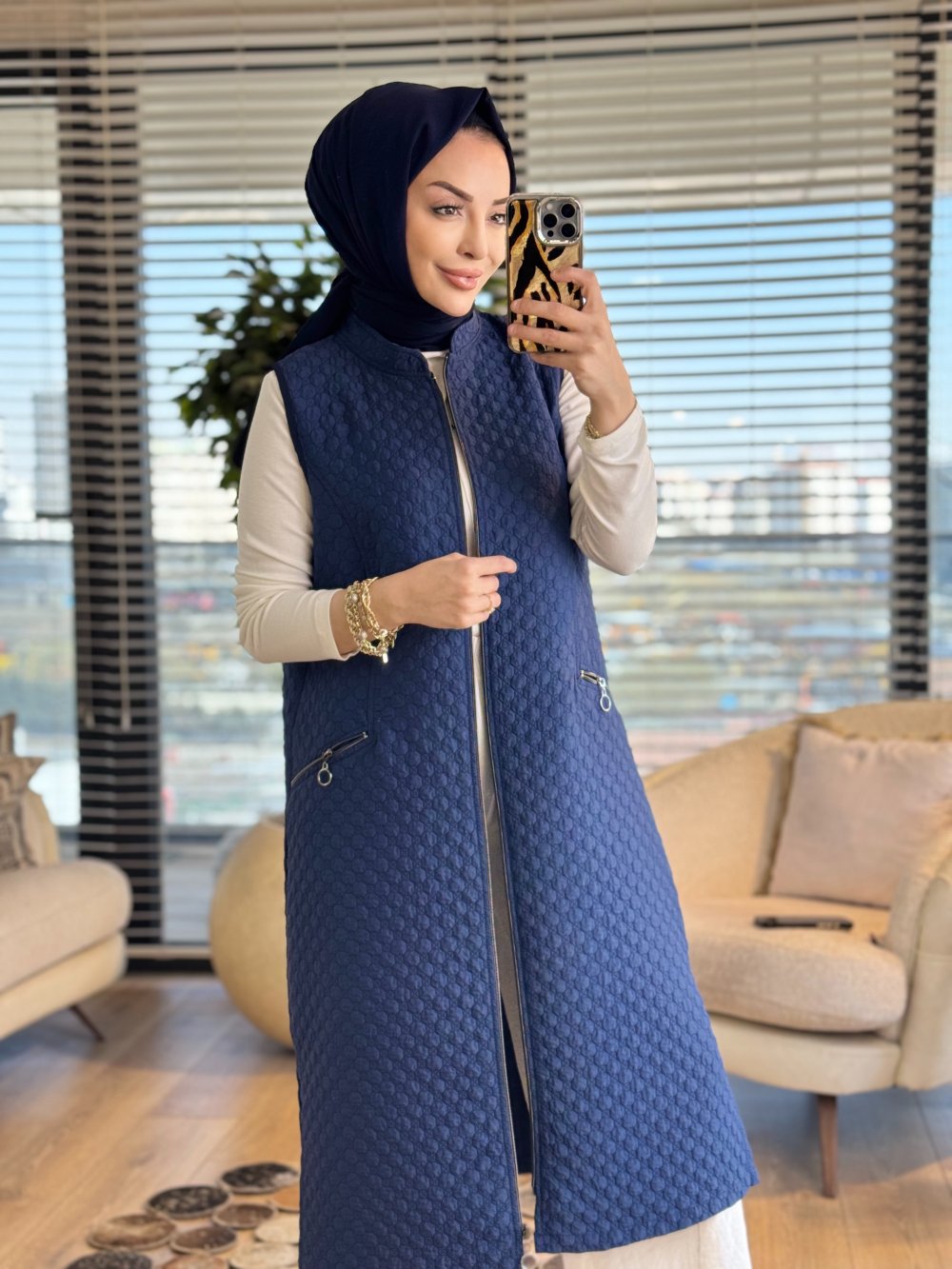 26450 Petek Desen Cebi Fermuarlı Yelek Lacivert