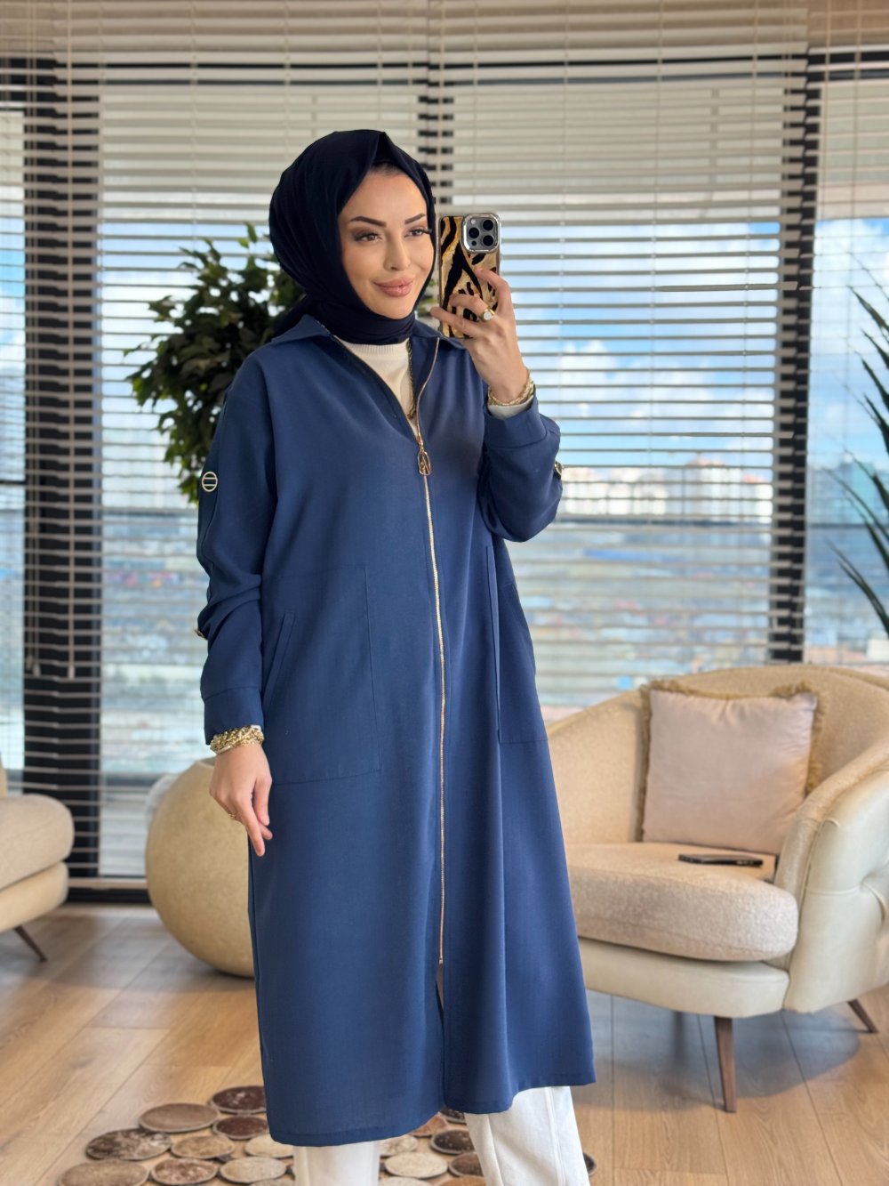 26YT516 Kolu Şeritli Ön Fermuarlı Kap İndigo