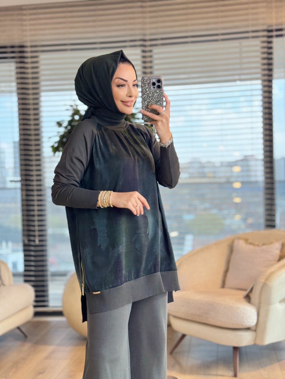279 Ön Arka Batık Desen Triko Tunik Haki
