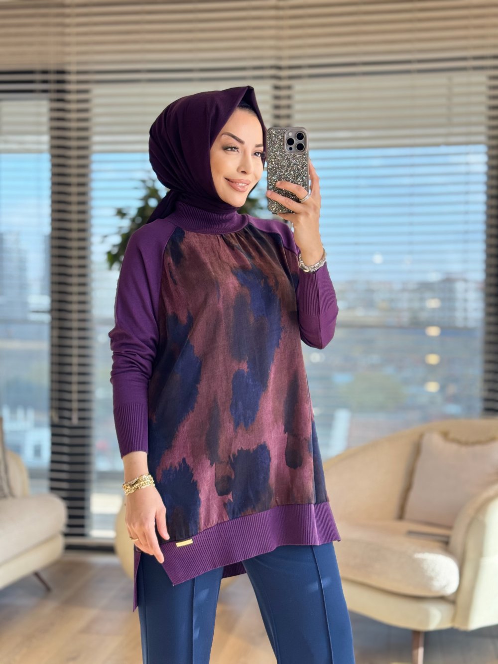 279 Ön Arka Batık Desen Triko Tunik Mürdüm
