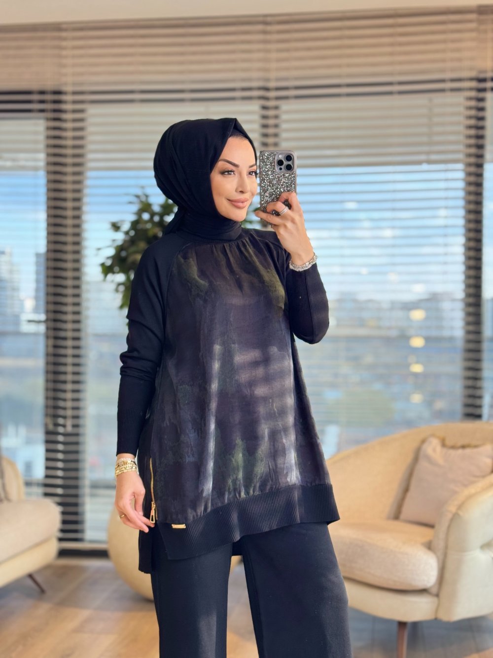 279 Ön Arka Batık Desen Triko Tunik Siyah
