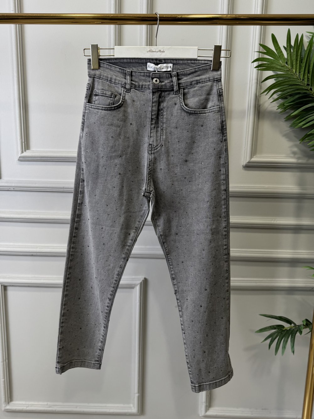 2804 Üstü Serpme Taş Baskılı Kot Pantolon Gri