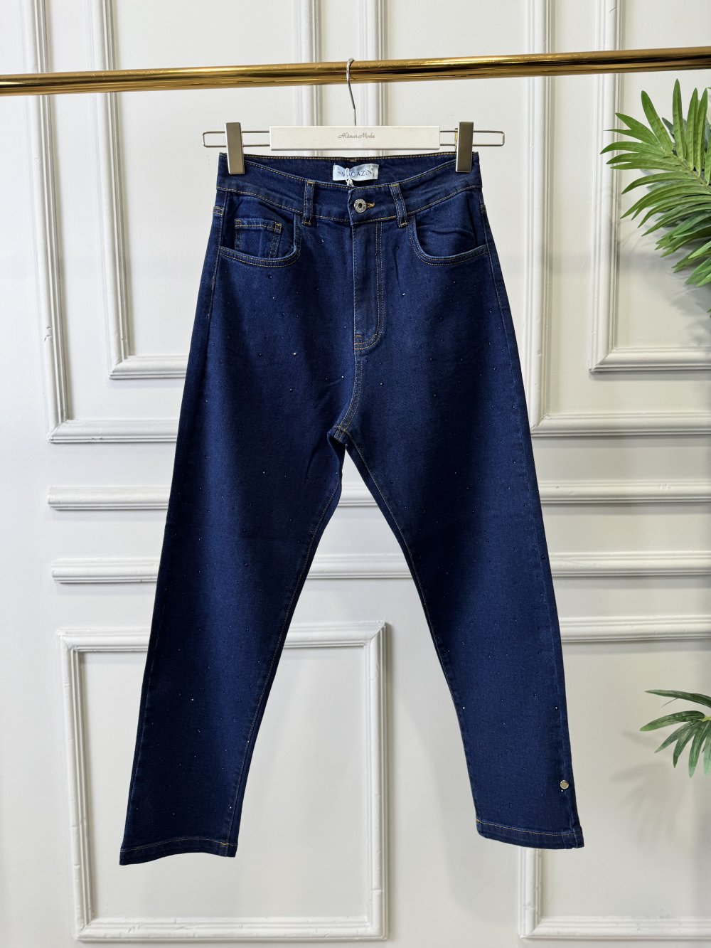 2804 Üstü Serpme Taş Baskılı Kot Pantolon Mavi