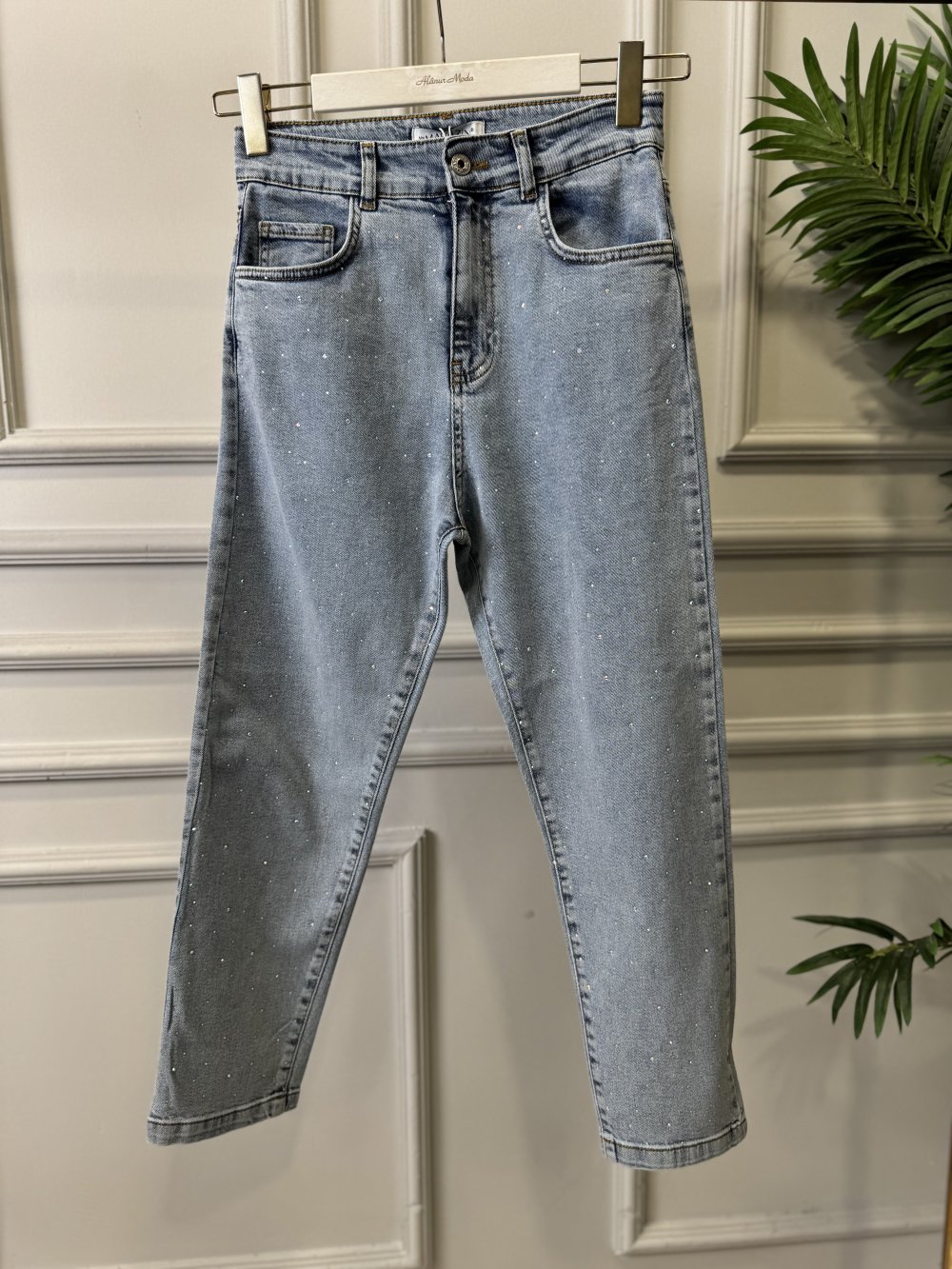2804 Üstü Serpme Taş Baskılı Kot Pantolon Mavi