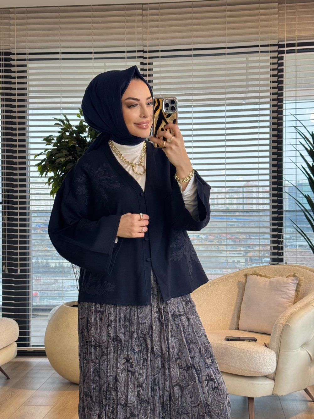 2813 Nakış Detaylı V Yaka Kimono Lacivert