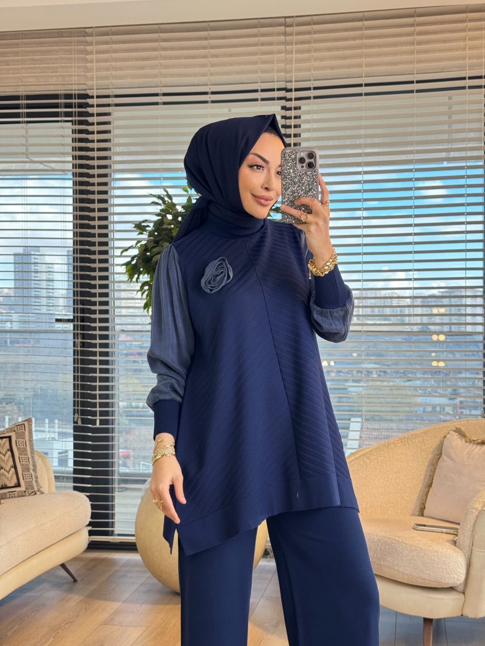 285 Kolları Kumaş Güllü Tunik Lacivert