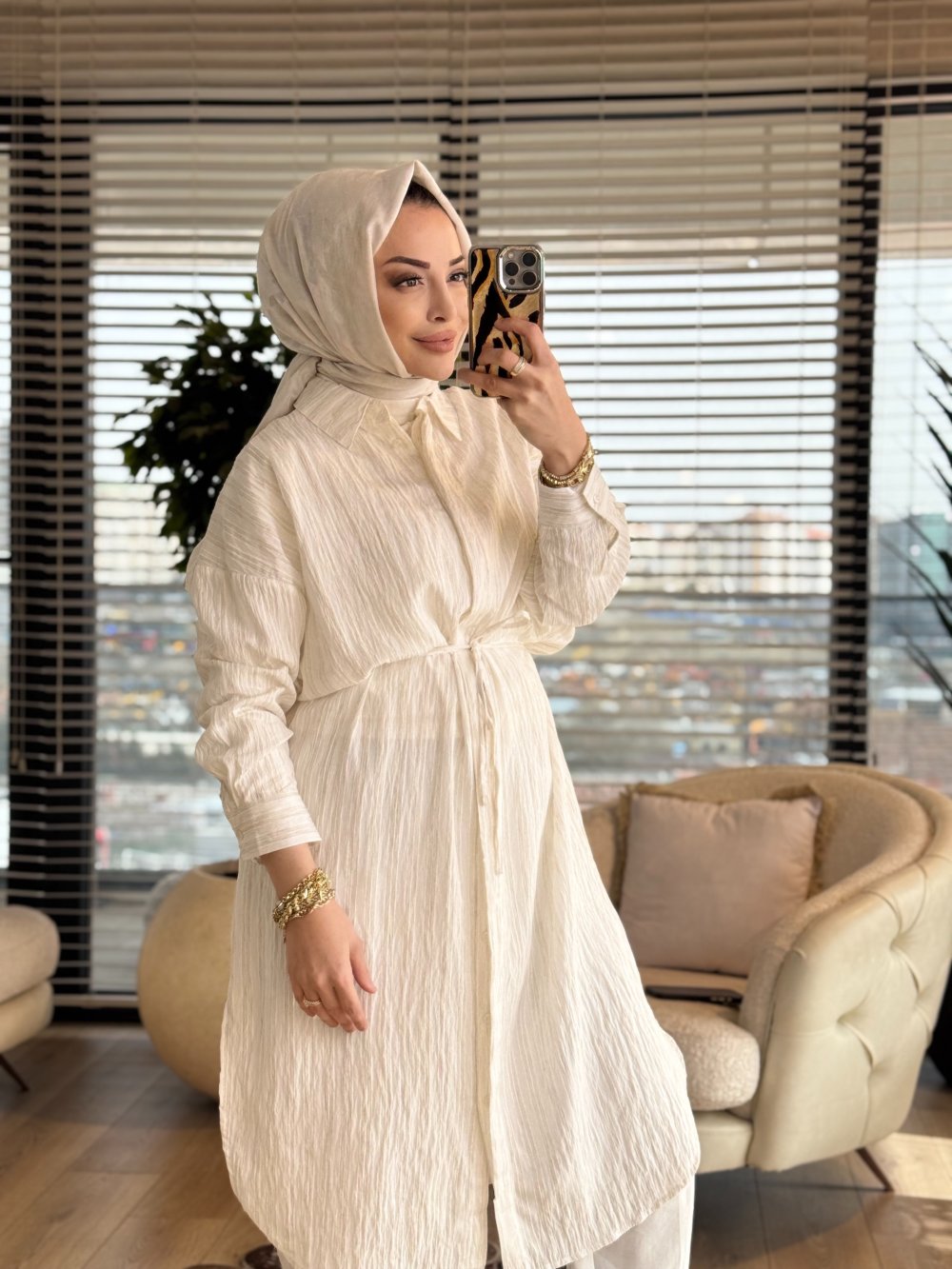 2858 Keten Midi Boy Çizgili Gömlek Bej