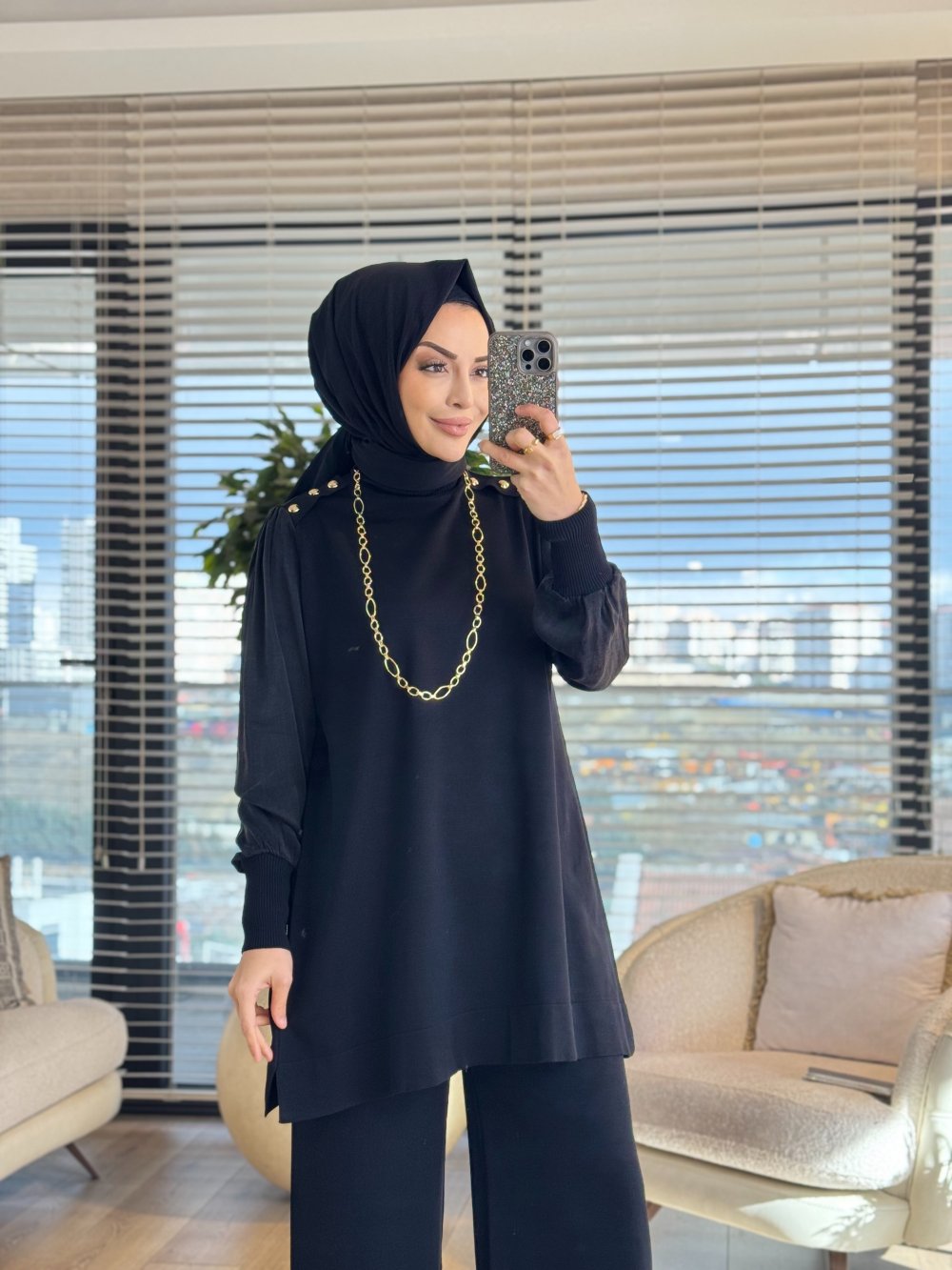 289 Omuzu Düğmeli Kupra Triko Tunik Siyah