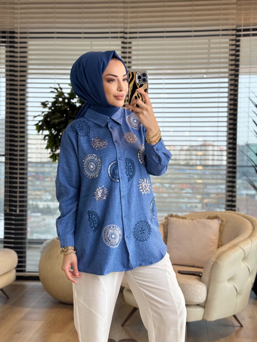 2914 Etnik Pul Ve Nakış İşlemeli Gömlek İndigo