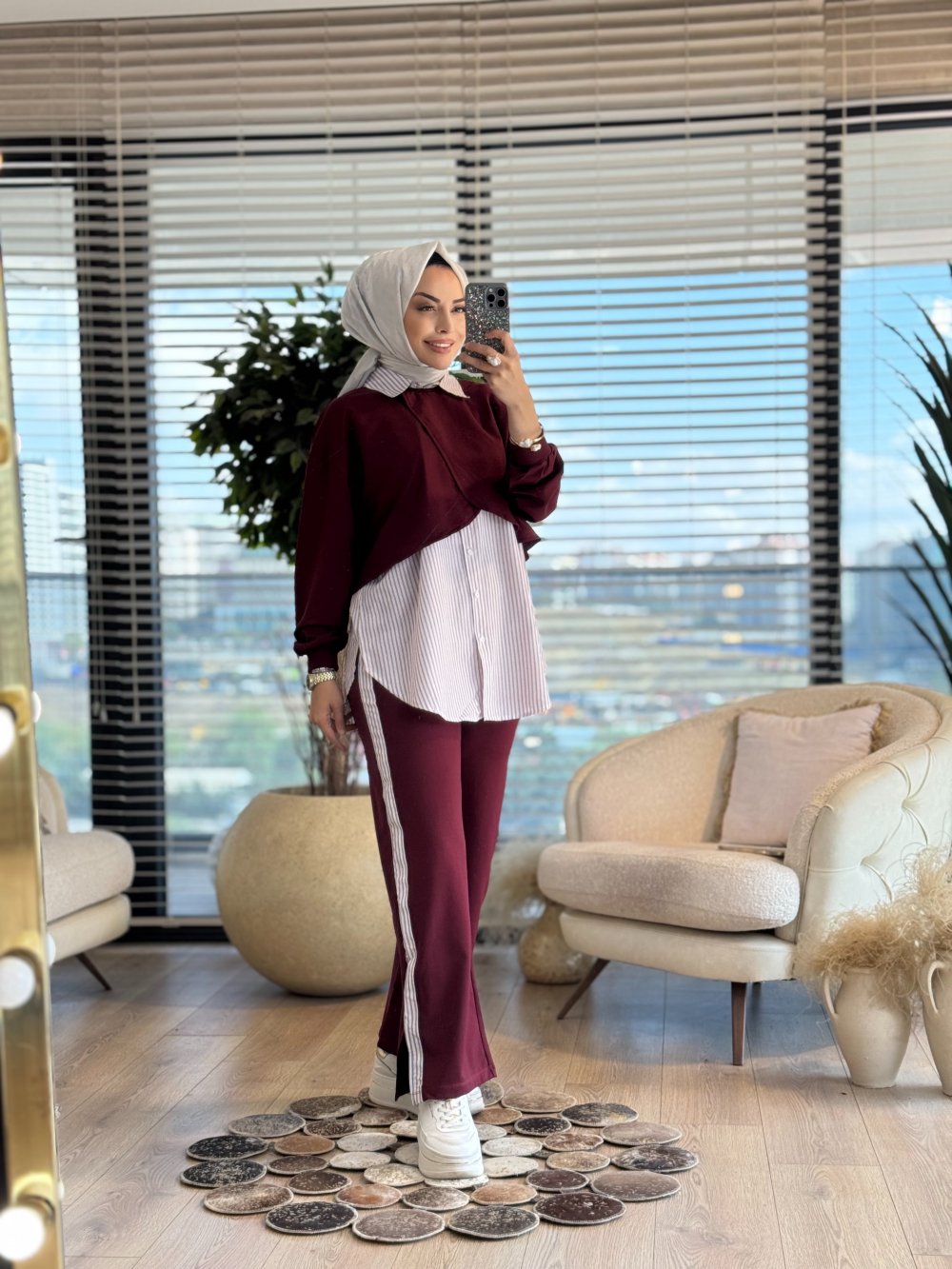 3064 Çizgi Garnili Pelerin Görünümlü Takım Bordo
