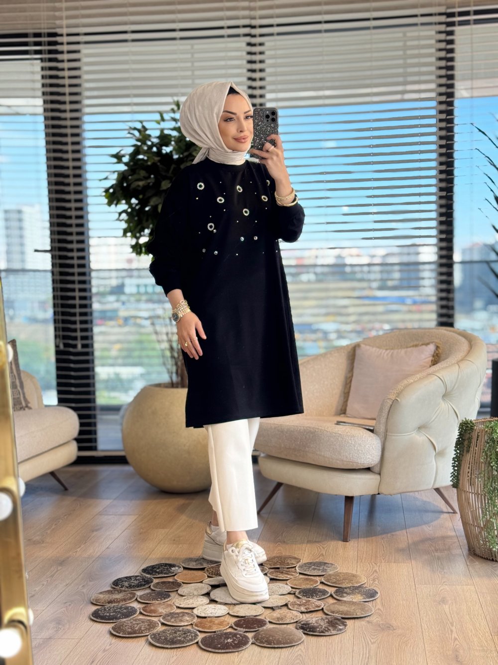 3138 Taş Ve İnci Detaylı Midi Boy SweatShirt Siyah