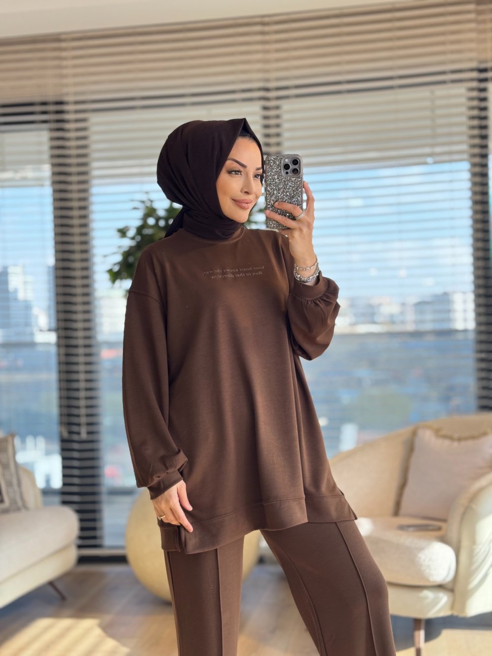 3149 Önü Baskı Detaylı Rahat Takım Kahve