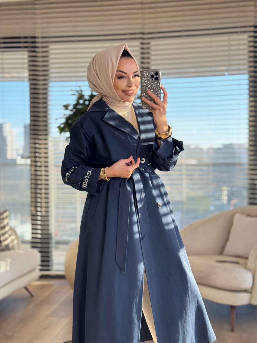 32139 Ön Arka Kol Yazı Baskılı Trenç Lacivert