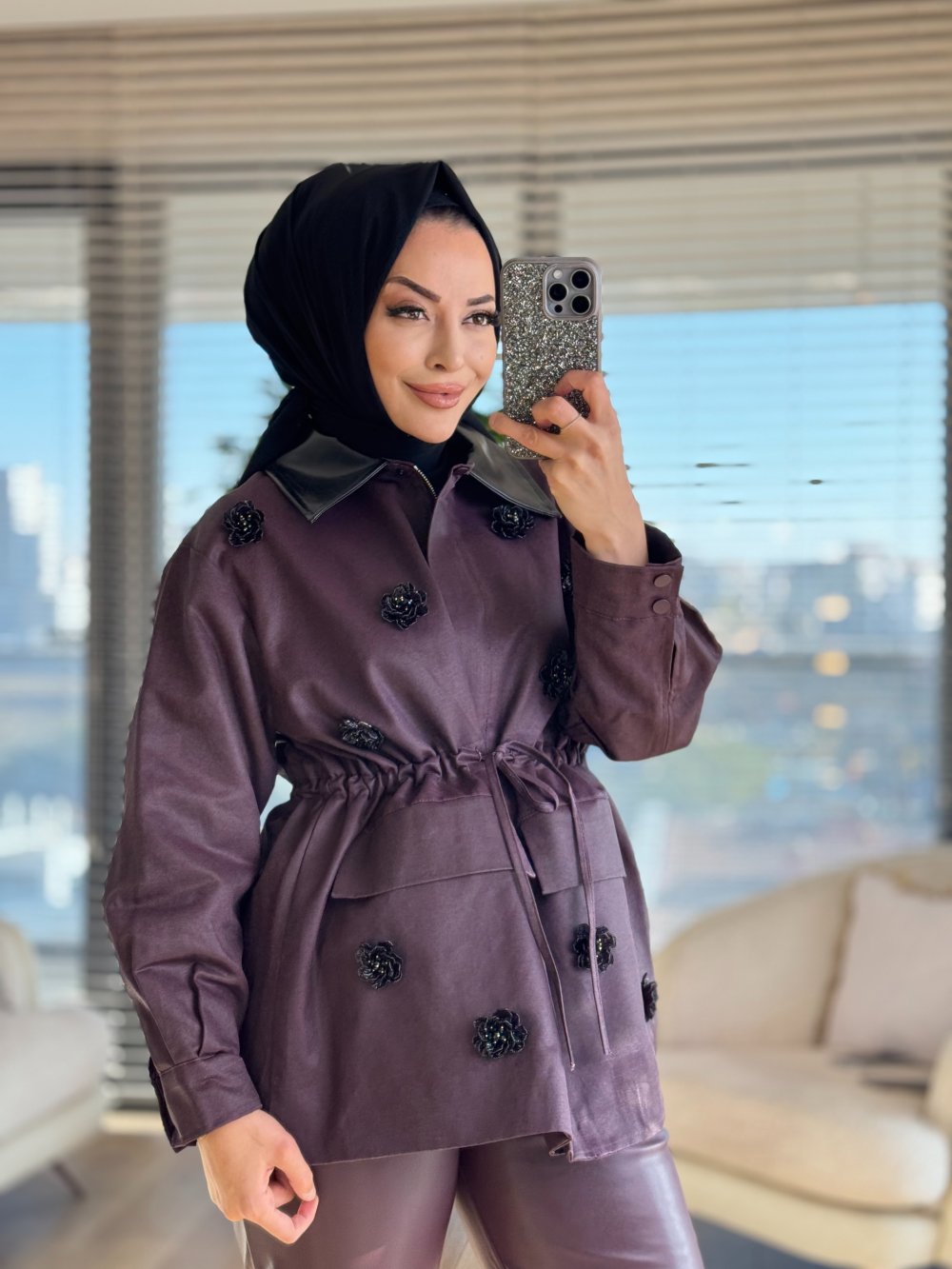 32446 Beli Büzgülü Önü Çiçek Figürlü Ceket Mürdüm