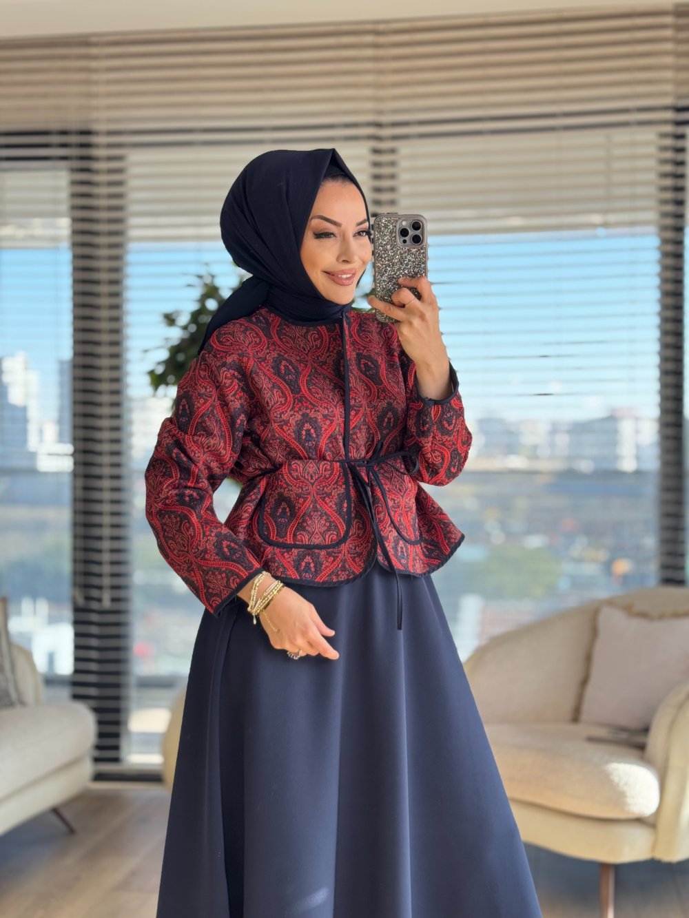 32447 Otantik Desen Önden Bağlamalı Ceket Kırmızı