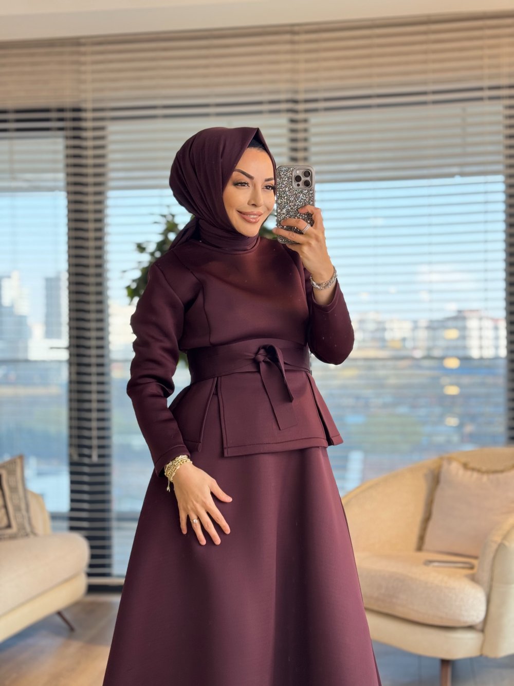 32459 Önü Kuşak Bağlamalı Etekli Takım Bordo