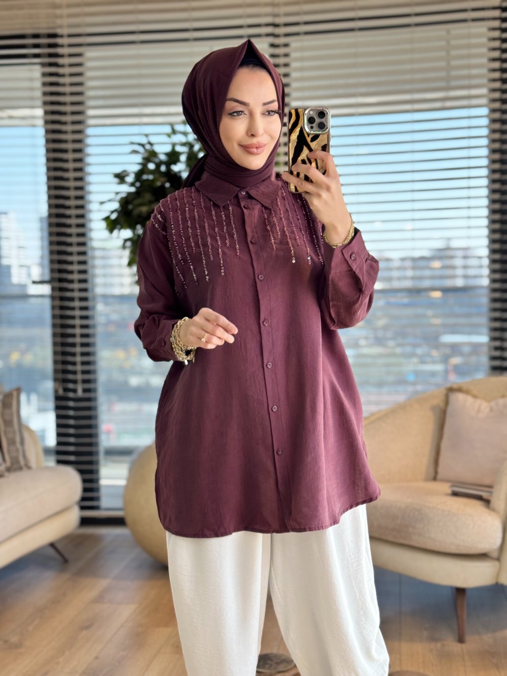 3272 Roba Sıralı Boncuk İşlemeli Gömlek Mürdüm