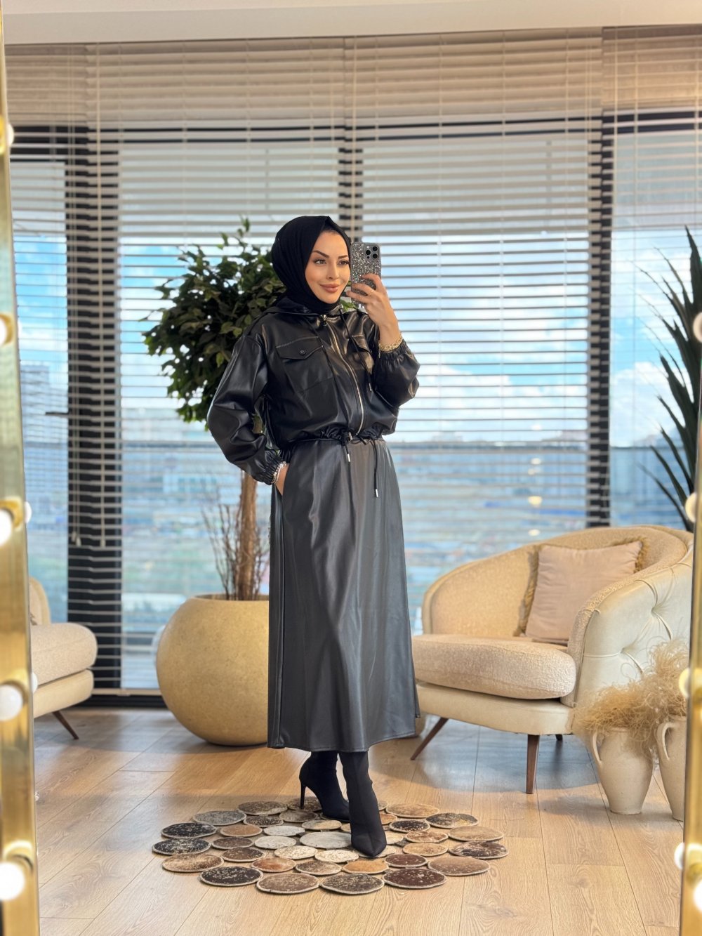 33736 Deri Kapşonlu Fermuarlı Etekli Takım Siyah
