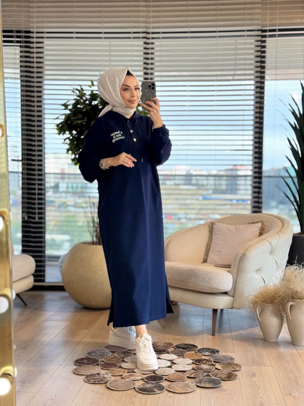 33744 Baskılı Kapşonlu Cepli Elbise Lacivert
