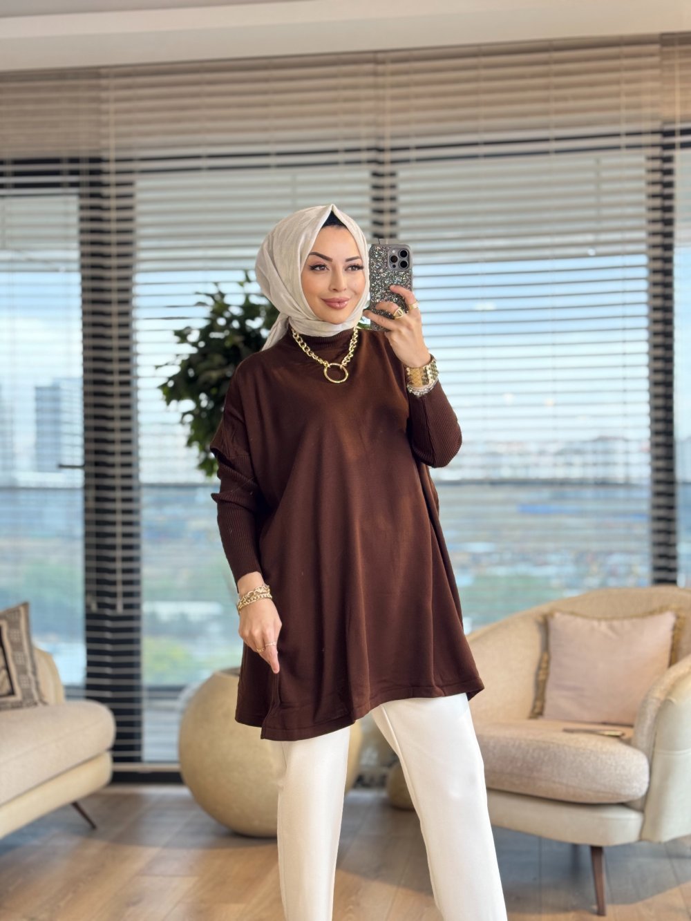 3399 Yarasa Kol Triko Tunik Kahve