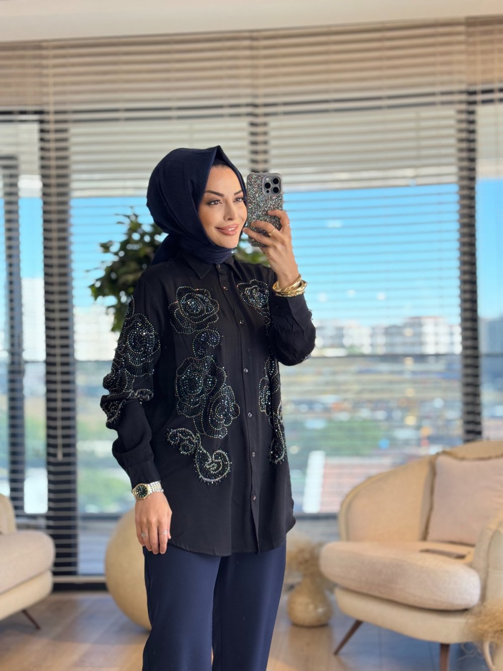 34608 Ön Kolu Boncuk Çiçek İşlemeli Gömlek Siyah