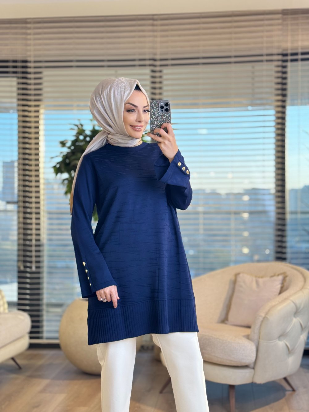 3503 Ön Kabartma Desenli Triko Tunik Lacivert
